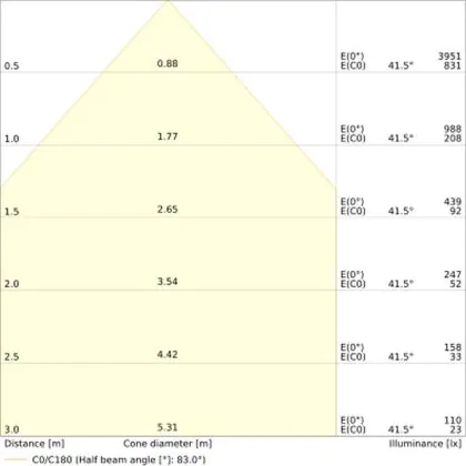 L'indice d'éblouissement unifié (UGR) indique dans quelle mesure la lumière d'un produit est éblouissante. Cette valeur varie d'une application à l'autre et doit être conforme aux normes européennes (EN 12464-1). Une faible valeur UGR signifie un faible facteur d'éblouissement. Pour les bureaux et les écoles, l'éclairage avec une valeur UGR < 19 est obligatoire, et pour les espaces ouverts, une valeur UGR < 22 est obligatoire.