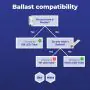 Un ballast régule la tension. Il permet de faire fonctionner les lampes qui ne peuvent pas être directement connectées à la tension du secteur. Y a-t-il un starter dans votre luminaire ? Il s'agit d'un ballast conventionnel (EM). Les luminaires équipés d'un ballast électronique (HF) n'ont pas de starter. Un driver LED, quant à lui, peut être comparé à un ballast électronique, il ne fonctionne qu'avec un éclairage LED.